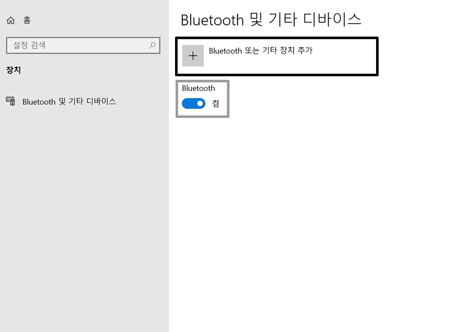 그 다음 블루투스를 설정할 수 있는 내용이 창에 표시되는데 상단의 + Bluetooth 또는 기타 장치 추가를 눌러준다.