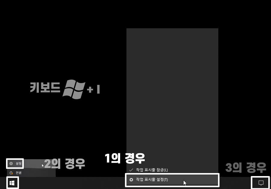1. 바탕화면의 작업표시줄을 우클릭한 다음 작업표시줄 설정을 눌러준다.