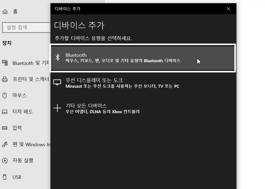 3. 디바이스 추가 창이 뜨면 Bluetooth를 클릭하고 디바이스를 찾아 연결해준다.
