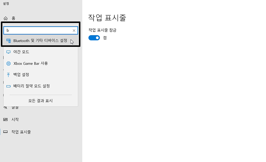 2. 작업표시줄 설정 창이 뜨면 설정 검색에서 Bluetooh를 입력해준다.