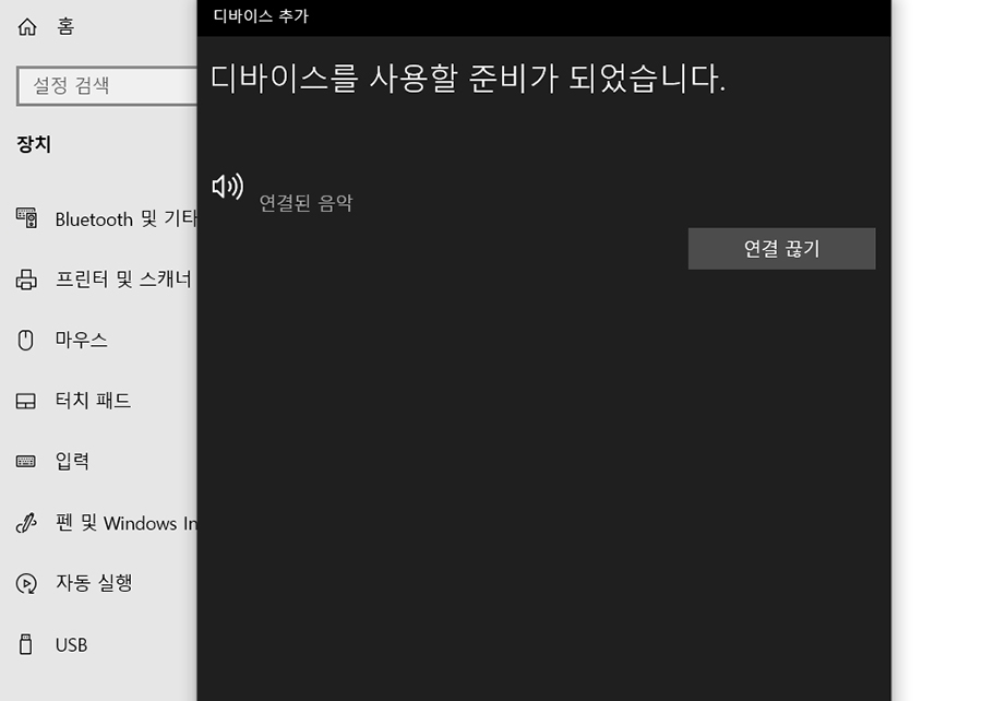 4. 정상적으로 페어링 되었다면 "디바이스를 사용할 준비가 되었습니다"라는 메시지와 함께 블루투스 이어폰 사용이 가능하게 된다.