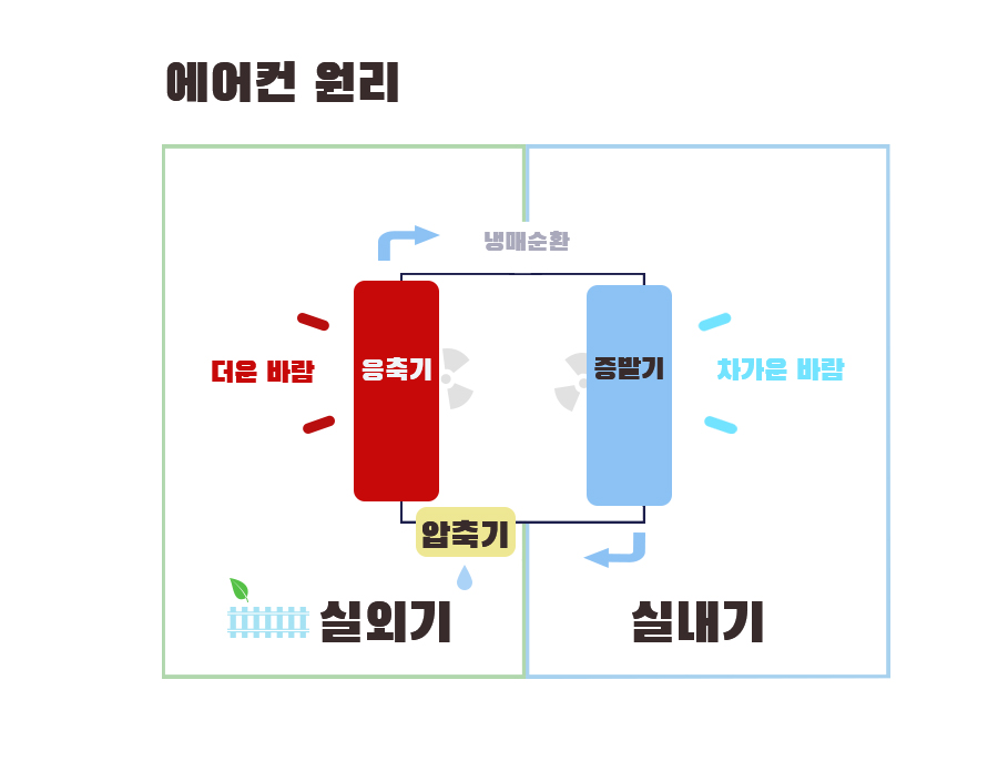 여름철 더울 때 사용하는 에어컨에서 시원한 바람이 나온다면 여름철 습할 때 사용하는 제습기에서는 더운 바람이 나온다.