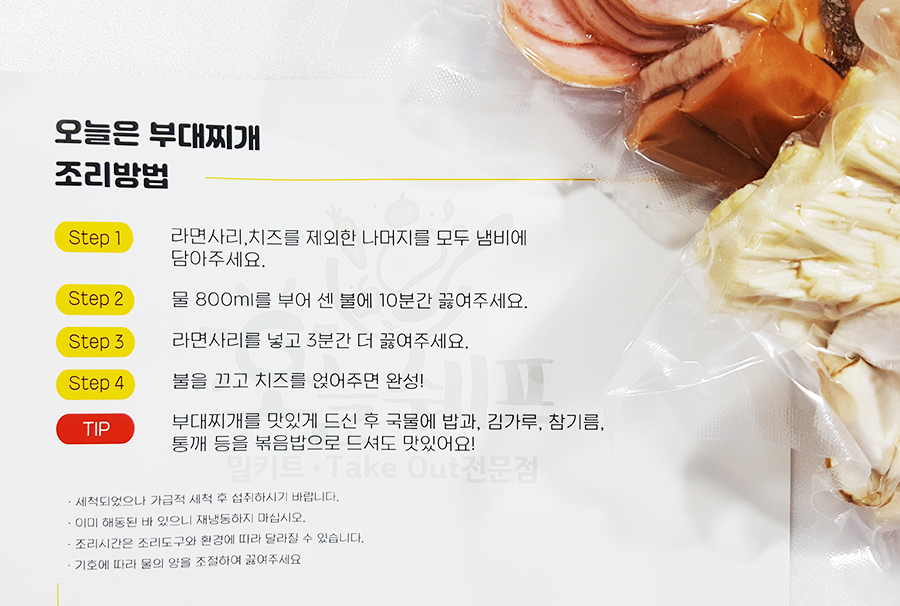 밀키트 테이크 아웃 전문점 오늘 쉐프의 부대찌개를 먹어보았다.