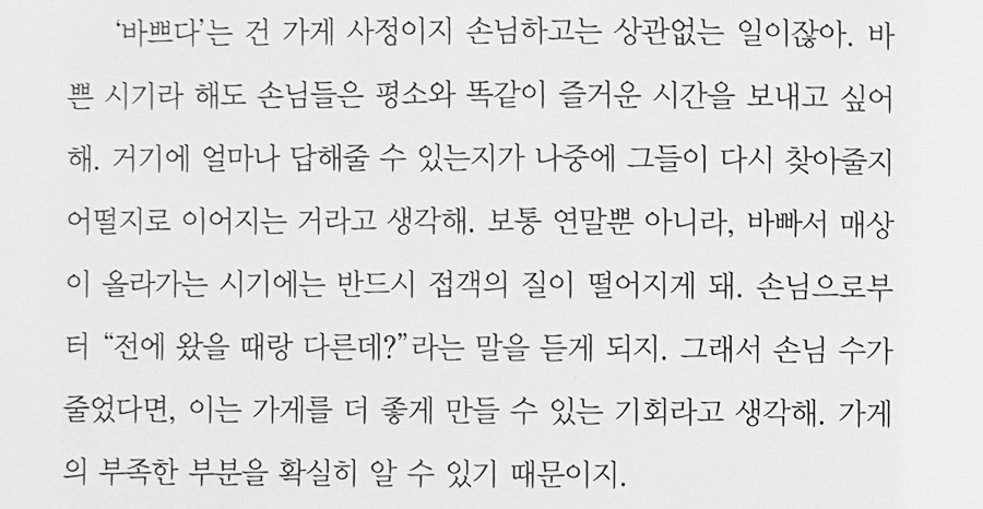 게다가 이 책이 좋았던 점은 손님으로서도 공감 가는 이야기들이 많아서 그 점을 짚어준 것이었다.