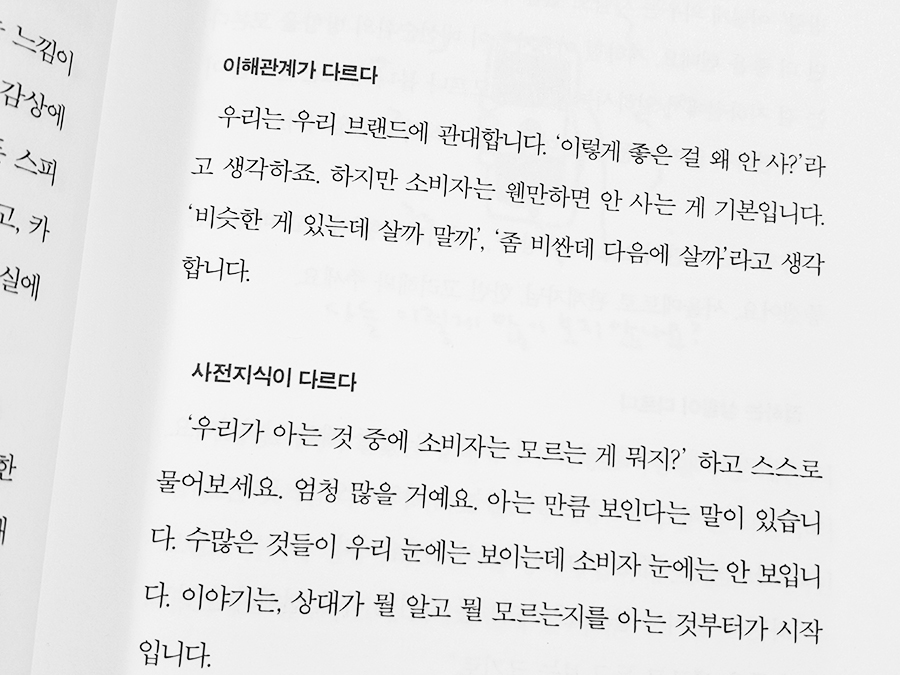 우리는 우리 브랜드에 관대합니다. '이렇게 좋은 걸 왜 안 사?'라고 생각하죠. 하지만 소비자는 웬만하면 안 사는 게 기본입니다. '비슷한 게 있는데 살까 말까', '좀 비싼데 다음에 살까'라고 생각합니다.