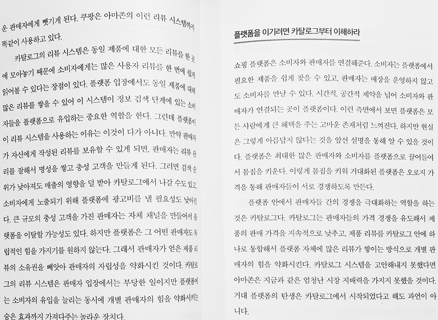 플랫폼 안에서 판매자들 간의 경쟁을 극대화하는 역할을 하는 것은 카탈로그다. 카탈로그는 판매자들의 가격 경쟁을 유도해서 제품의 판매 가격을 지속적으로 낮추고, 제품 리뷰를 카탈로그 안에 하나로 통합해서 플랫폼 자체에 많은 리뷰가 쌓이는 방식으로 개별 판매자의 힘을 약화시킨다.