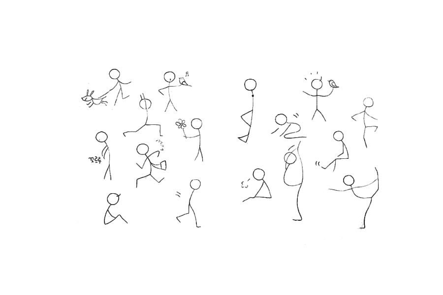 이 드로잉의 핵심은 동그라미를 하나 그려주고 척추의 방향을 결정하고 팔과 다리를 그려주면 끝이다.
