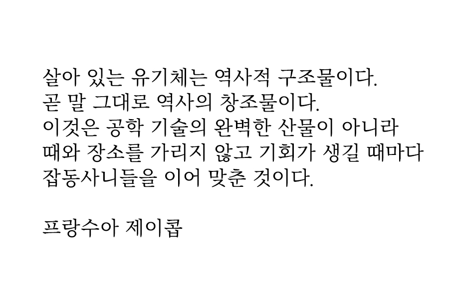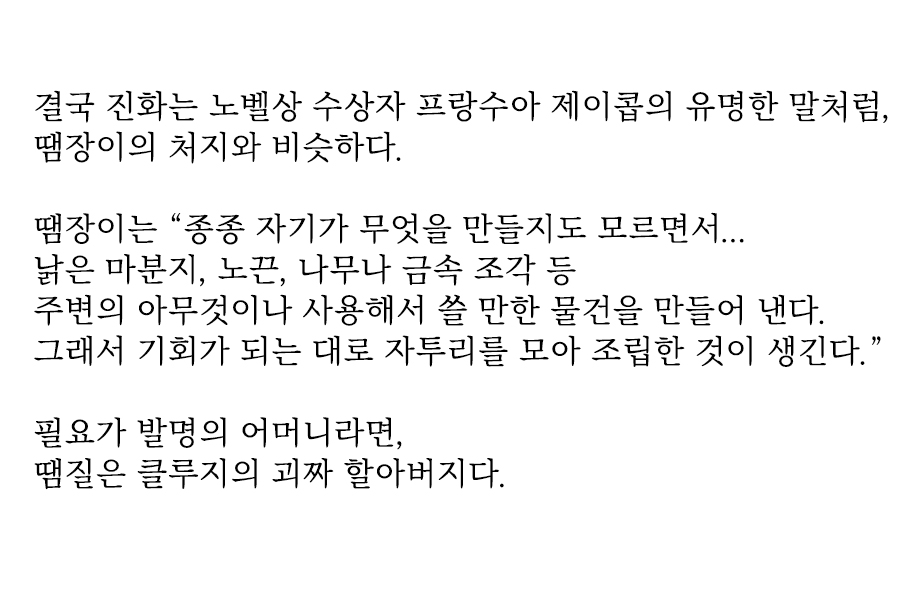 "진화란, 마치 뛰어난 공학자가 어떤 문제를 풀기 위해 가장 합리적인 해결책을 찾는 것처럼 진행되는 것이 아니라, 지금까지 진화해온 것들을 바탕으로 당장 그런대로 쓸 만한 해결책이 발견되면, 그것이 선택되는 방식으로 이루어진다는 것이다."
