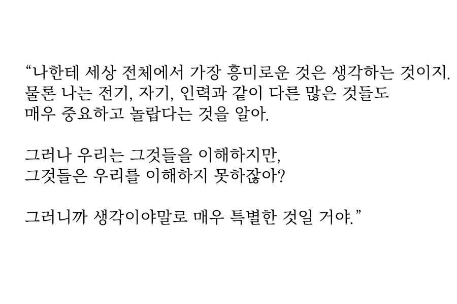 "나한테 세상 전체에서 가장 흥미로운 것은 생각하는 것이지. 물론 나는 전기, 자기, 인력과 같이 다른 많은 것들도 매우 중요하고 놀랍다는 것을 알아. 그러나 우리는 그것들을 이해하지만, 그것들은 우리를 이해하지 못하잖아? 그러니까 생각이야말로 매우 특별한 것일 거야."