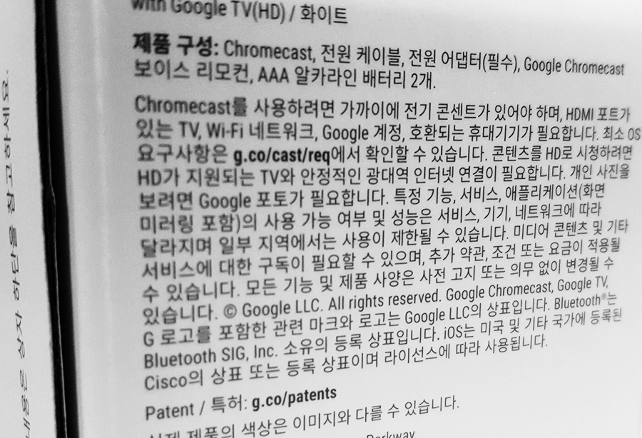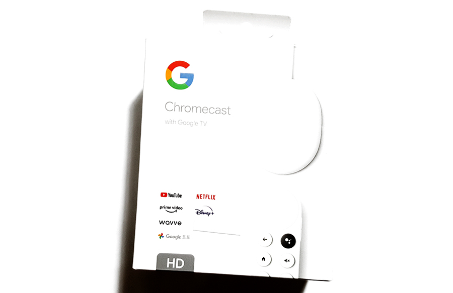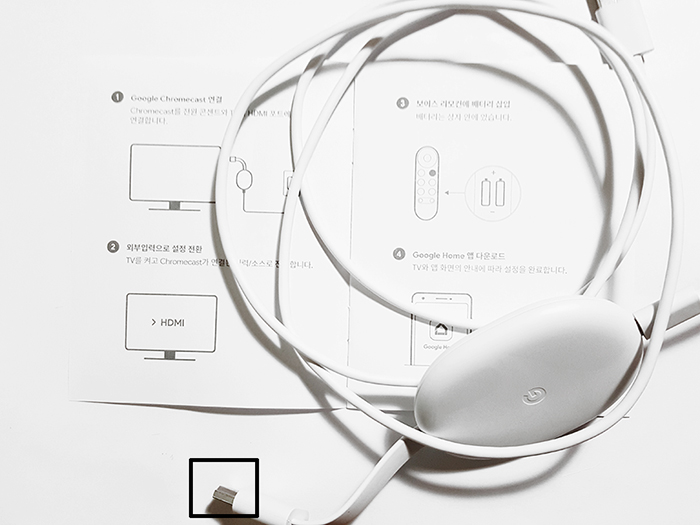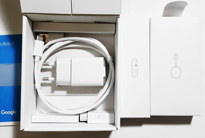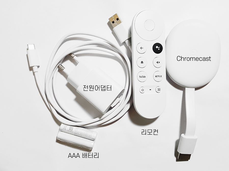 제품(Chromecast with Google TV HD)에는 구글 크롬캐스트, 리모컨, 전원 케이블, 전원 어댑터(전원콘센트), AAA 배터리 2개가 들어있다.