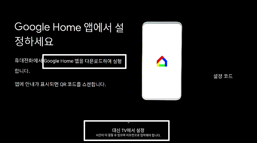 Goole home 앱 설치 없이도 TV 화면에서 바로 리모컨 동작으로 설정도 가능하니 '대신 TV에서 설정'을 선택해 연결을 완료해도 된다.