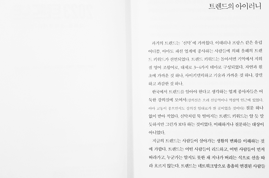 게다가 책이 세련됐다. 물론 내가 트렌드에 관한 책은 읽어본 적이 없어서 다른 책은 어떤지 잘 알지 못하지만 글이 그렇게 느껴져서 좋았다.