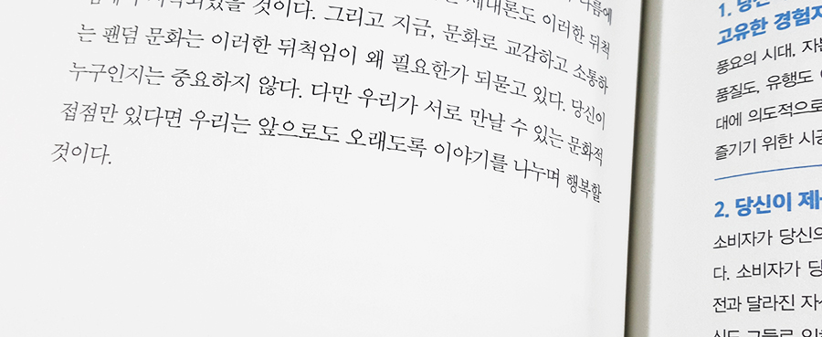 과거의 유행이 신탁으로 만들어졌든, 지금의 트렌드가 정말 경향으로 만들어졌든 책에서 말하는 흐름, 트렌드, 진단, 분석은 같은 시대를 살아가는 사람으로서 체감하지 못할 내용들은 아니긴 했다.