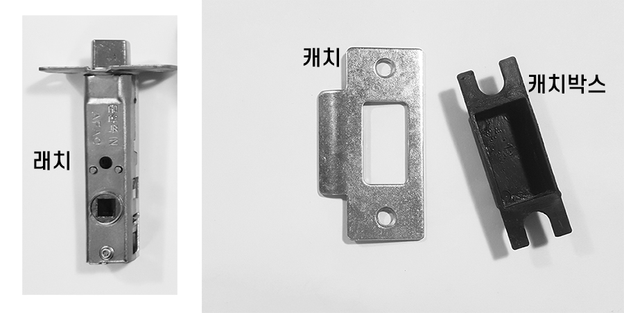 조립할 때는 기존 캐치의 피스를 풀고 캐치박스가 방문 고리의 래치 버튼에 걸릴 수 있게 확인해 가며 조립해 준다.