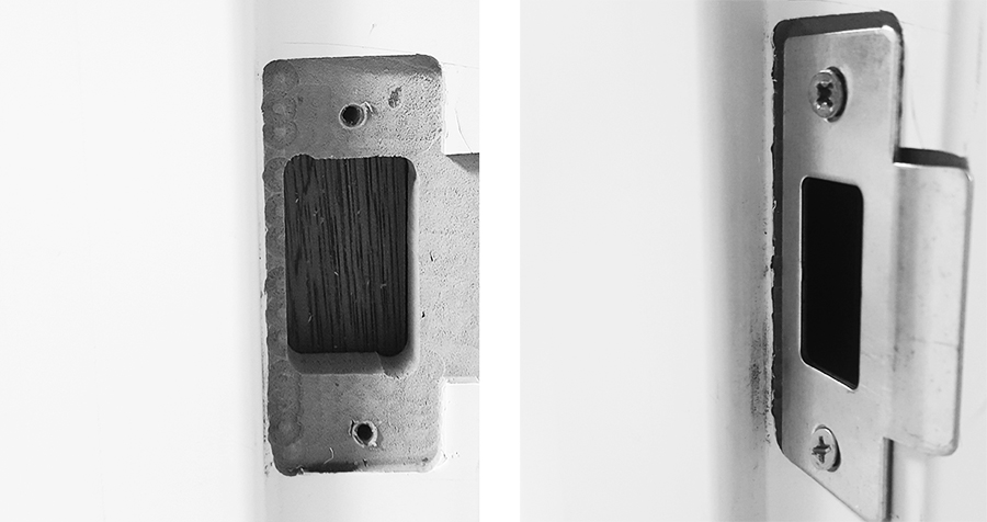 보통 래치박스를 안쪽으로 밀어 다시 조립해 주면 래치 버튼이 캐치에 걸리며 방문이 쉽게 안 열린다.