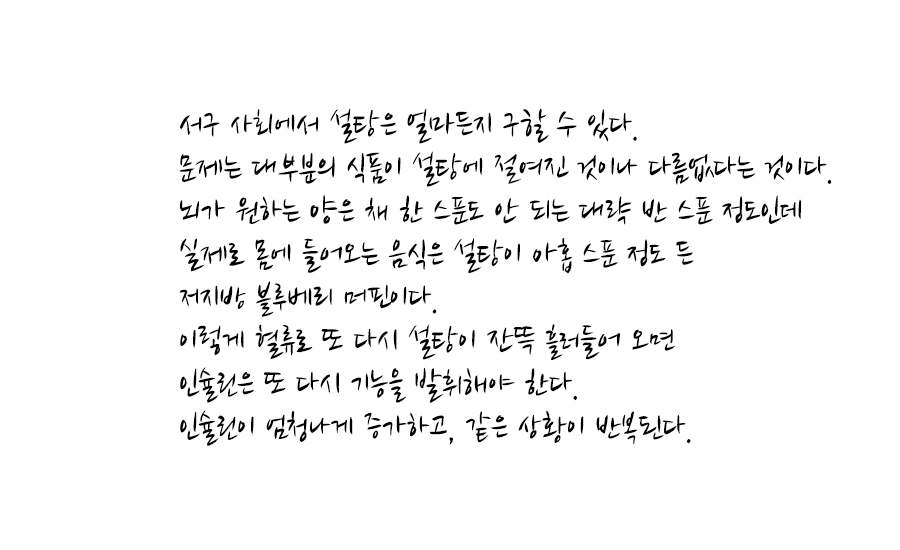 이렇게 혈류로 또 다시 설탕이 잔뜩 흘러들어 오면 인슐린은 또 다시 기능을 발휘해야 한다. 인슐린이 엄청나게 증가하고, 같은 상황이 반복된다.