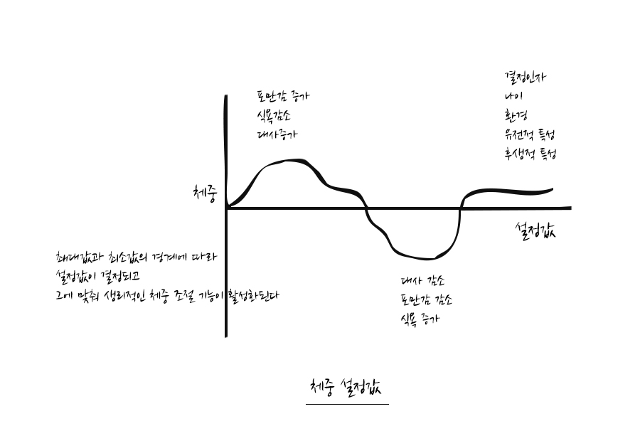 그 말은 식습관, 운동 또한 체중 설정값을 낮추기 위해 필요한 것이라는 뜻도 된다. 여러 가지 내용들이 적혀있었지만 책의 중요한 요지로는 그렇게 읽혔다.