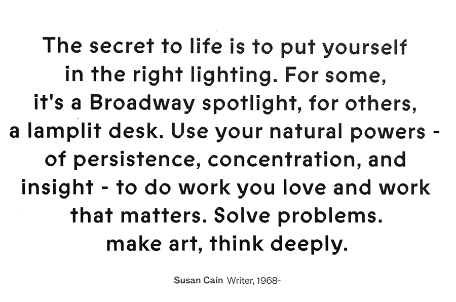 인생의 비결은 자신을 올바른 조명에 비추는 것입니다. 어떤 이들에게는 브로드웨이의 스포트라이트이고, 다른 이들에게는 등불이 켜진 책상입니다. 인내심, 집중력, 통찰력 등 여러분의 타고난 힘을 사용하여 여러분이 사랑하는 일을 하고 중요한 일을 하세요. 문제를 해결하고, 예술을 만들고, 깊이 생각해 보세요.