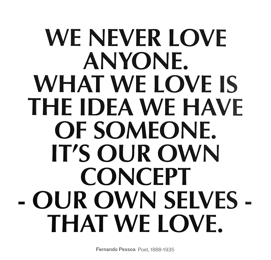 우리는 아무도 사랑하지 않는다. 우리가 사랑하는 것은 어떤 사람에 대해 우리가 갖고 있는 생각이다. 이는 우리가 만든 개념이므로 결국 우리는 우리 자신을 사랑해야 한다.