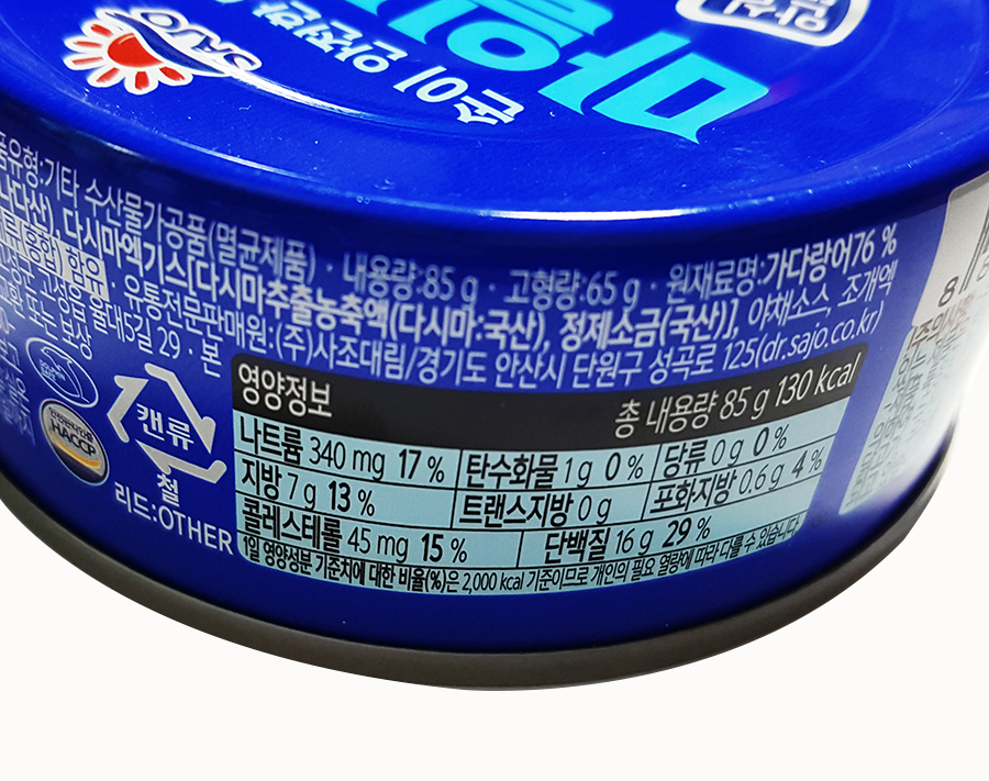 또한 동원이 (85g 살코기 기준 : 동원 180kcal , 사조 210kcal) 사조보다 칼로리가 낮은 편이기도 하다.