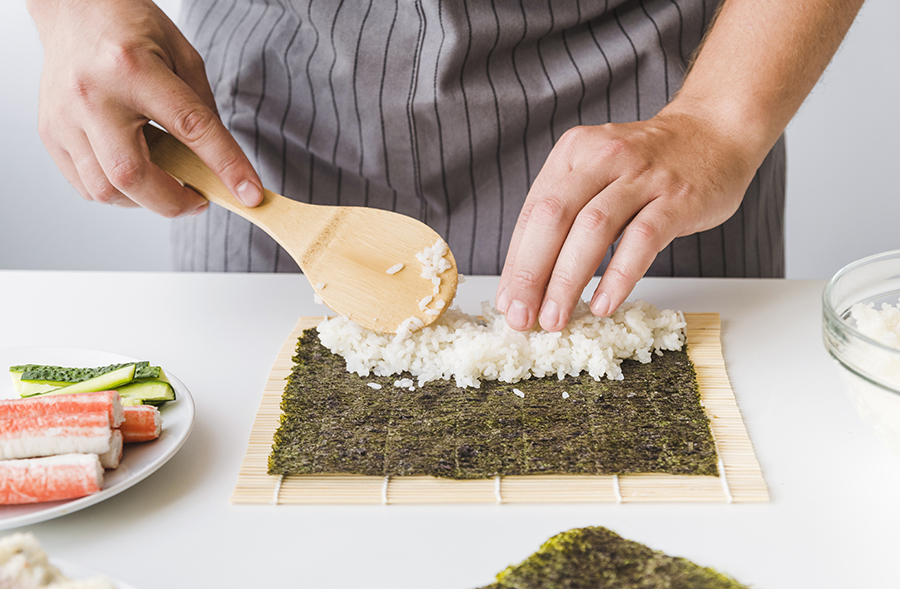 김밥 1인분의 밥알 양은 약 120g이나 기호에 맞게 사용하며, 펼칠 때도 도구를 사용하기보다 동그랗게 집어 손으로 피면 잘 펴지는 편이다.