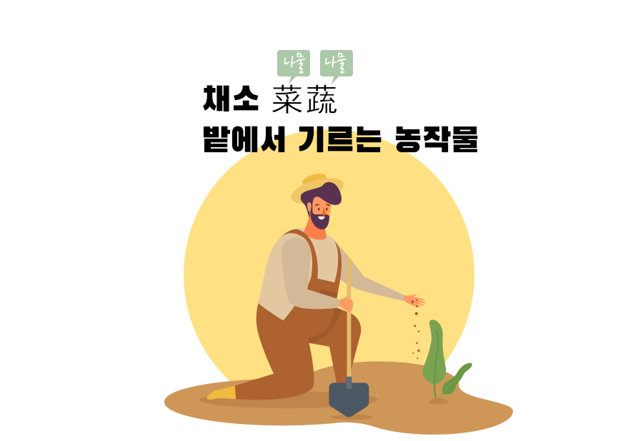 야채는 들에서 자라는 나물을 뜻하고, 채소는 밭에서 기르는 농작물을 뜻한다.