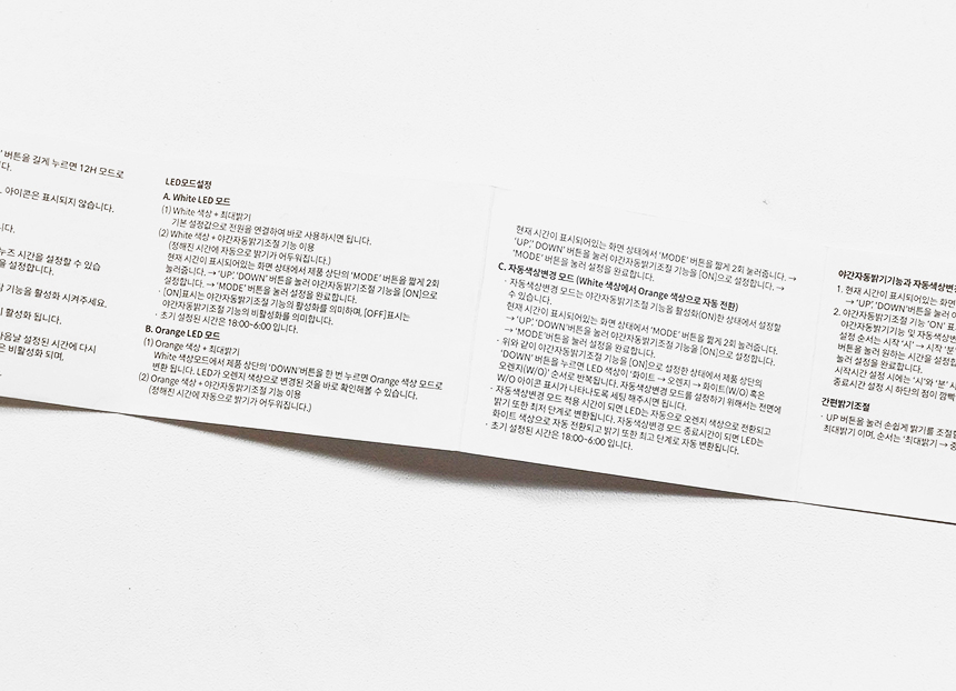 이는 무아스 듀얼컬러 미니 LED 시계(모델명 HX06B-0501000-AK) 기준이며 제품 설명서에도 볼 수 있는 내용이다. 설명서에는 시간과 알람 설정, 간편밝기조절, 자동색상변경 시간 설정 외에도 LED모드 설정하는 법도 포함되어 있다.