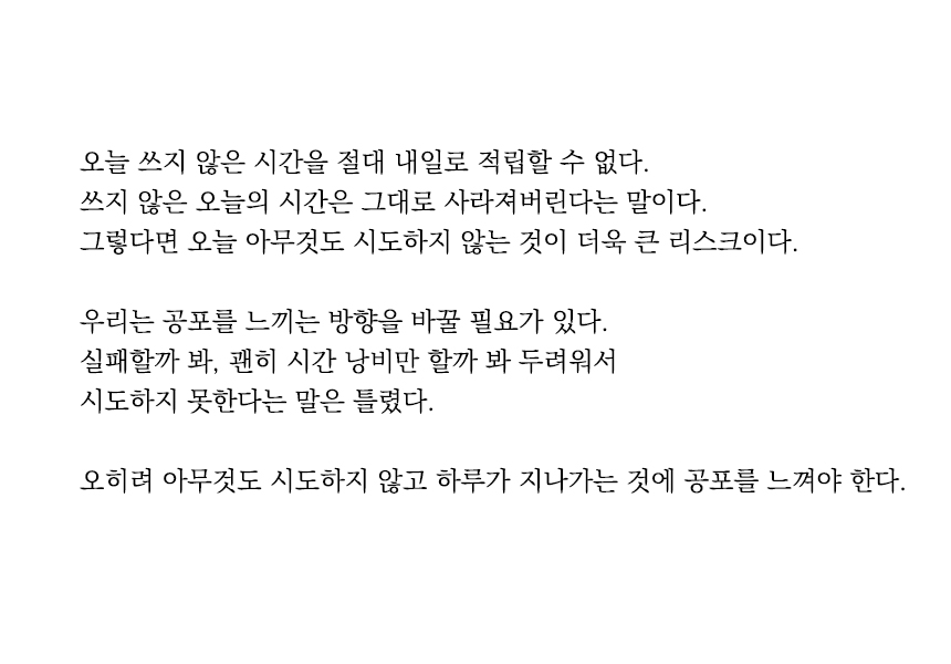 우리는 공포를 느끼는 방향을 바꿀 필요가 있다. 실패할까 봐, 괜히 시간 낭비만 할까 봐 두려워서 시도하지 못한다는 말은 틀렸다. 오히려 아무것도 시도하지 않고 하루가 지나가는 것에 공포를 느껴야 한다.