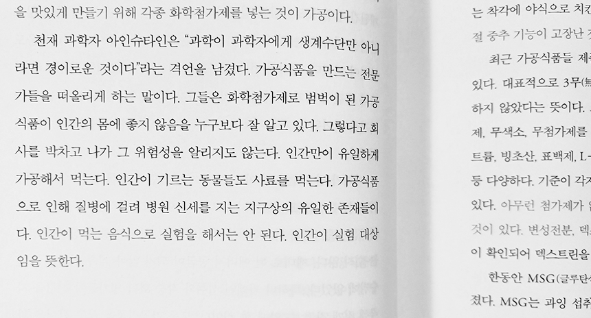 흔히 우리는 자연은 순수하고, 과학은 믿을 수 있다고 여기는 면이 큰데 넓게 보면 이미 채소와 과일도 자본주의 산업과 그 토양 안에서 길러지고 있고, 과학 또한 자본주의 시스템 속에서 살아가는 과학자나 연구자가 하는 것이므로 그 말이 의미하는 바가 뭔지 다각도로 잘 생각해 보면 좀 더 이 많은 내용들을 이해하는 데 도움이 되지 않을까 싶다.