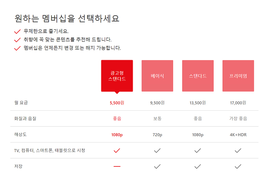 여러 멤버십 다 이용하면서 비교해봐도 광고나 화질 제외하면 큰 차이나 불편이 있는지 지금도 잘 모르겠다.