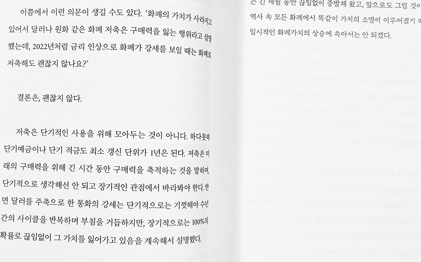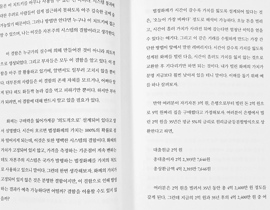 어쨌든 은행에 예금한 저축만이 최고고 자산이라 믿고 있다면 화폐 가치는 계속 떨어진다는 것은 자명한 사실인 듯 보이고, 미래를 위해 자산을 증식시키고자 한다면 이 책을 차근차근 한번쯤 읽어봐도 좋을 것으로 보인다.