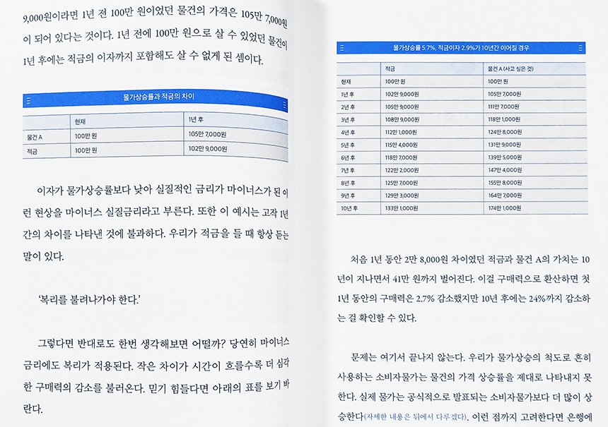 예컨대 100만 원을 적금에 넣었을 때 1년 후에 받을 수 있는 원금과 이자가 102만 9,000원이라면 1년 전 100만 원이었던 물건의 가격은 105만 7,000원이 되어 있다는 것이다. 1년 전에 100만 원으로 살 수 있었던 물건이 1년 후에는 적금의 이자까지 포함해도 살 수 없게 된 셈이다.