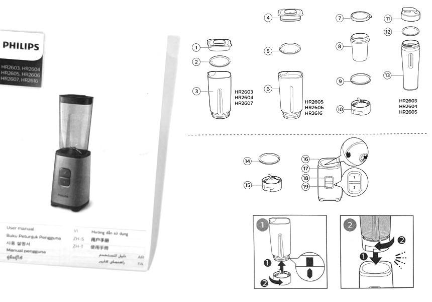 이 제품은 필립스 미니 소형 블렌더 HR2603/90 모델명 믹서기고 블렌더 본체, 블렌딩 용기와 구입하기에 따라 텀블러, 멀티 다지기도 함께 준다.