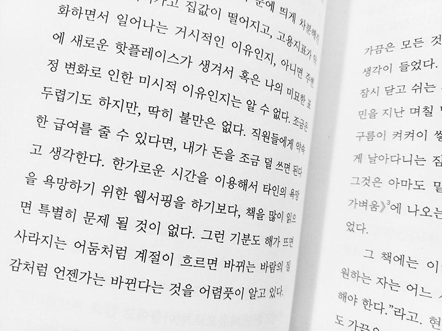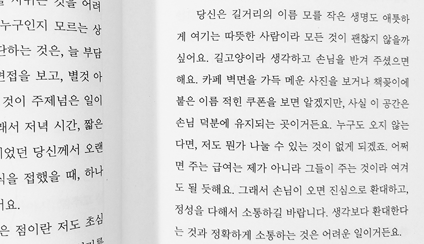 그런데 지금 생각해 보면 현실감이 안 느껴진 것은 카페를 저자와 같은 마음으로 운영하는 사장과 직원의 모습이 잘 안 그려져서 였을지도 모르겠다.