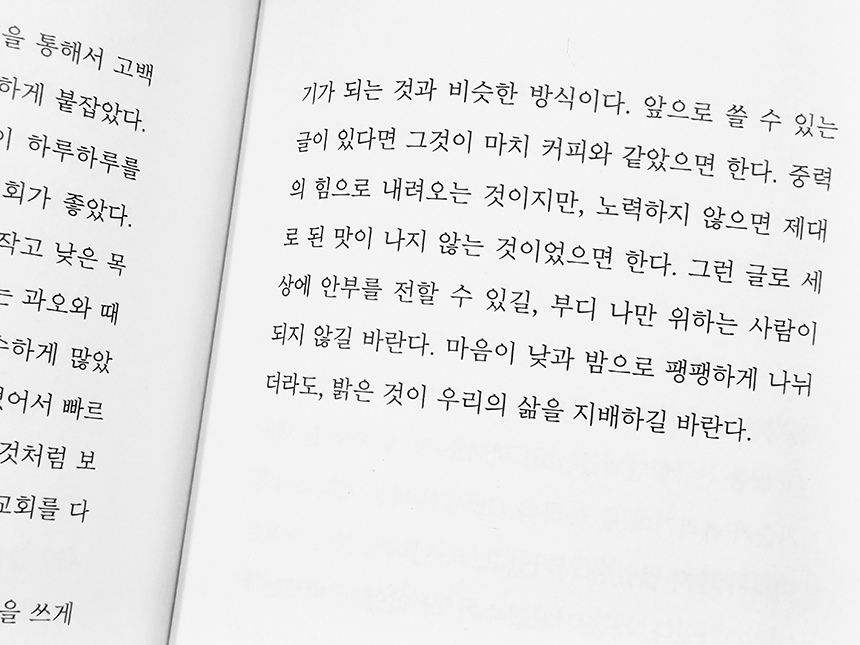 하지만 좀 더 심플하고 가볍고 와 닿을 수 있는 담백한 글이었으면 좋았을 것 같다.