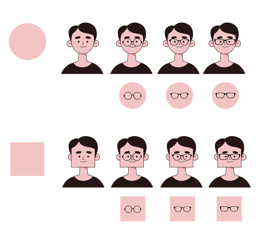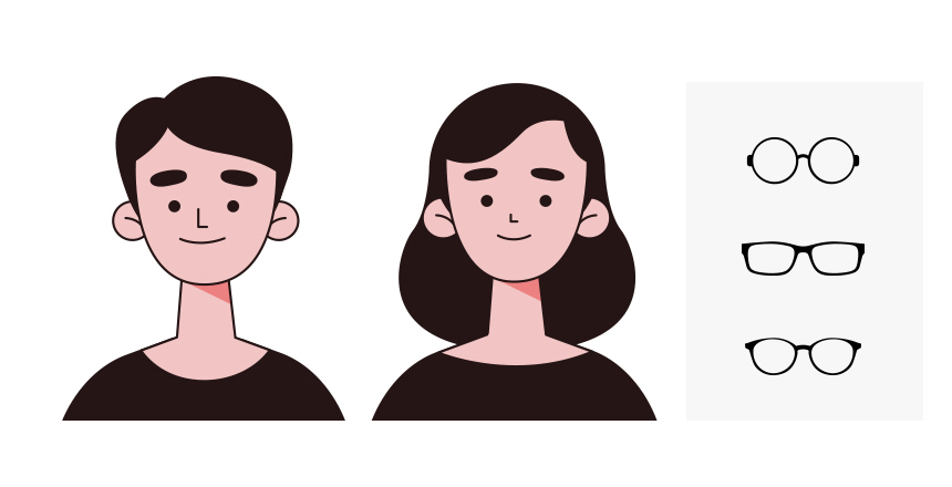 예를 들어 얼굴형이 네모난 편이라면 네모난 얼굴형을 더 부각시킬 수 있는 각진 형태의 안경보다는 둥근 형태의 안경이 네모난 얼굴형을 부드럽게 보완해 줄 수 있어 추천된다.