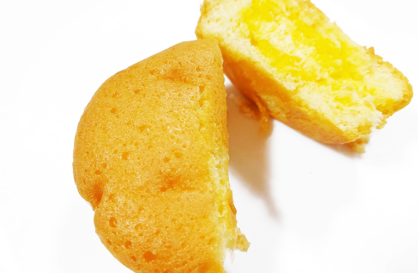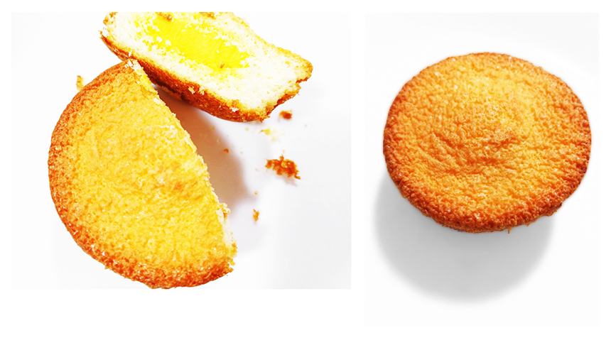 뜯어서 보면 동그랗긴 하지만 오리온 카스타드와는 약간 다르게 각진 동그란 모양이고, 질감도 오리온에 비해서는 덜 무른 편이다. 색도 오리온 카스타드보다는 약간 짙다.
