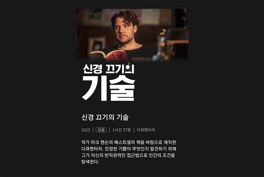 The Subtle Art of Not Giving a #@%!은 우리나라에는 신경 끄기의 기술이라는 제목으로 출판되었던 저자가 등장하는 다큐멘터리다.