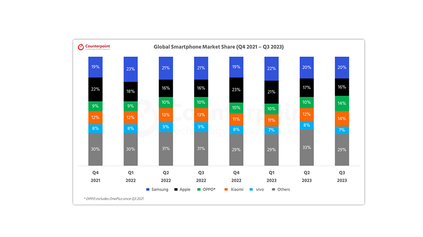 한편 전 세계 스마트폰 시장 점유율은 삼성이 근사한 수치로 애플보다는 판매량이 많은 편에 속한다.