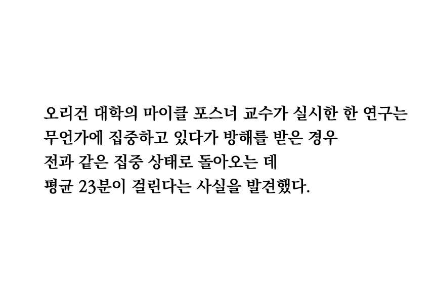 오리건 대학의 마이클 포스너 교수가 실시한 한 연구는 무언가에 집중하고 있다가 방해를 받은 경우 전과 같은 집중 상태로 돌아오는 데 평균 23분이 걸린다는 사실을 발견했다.