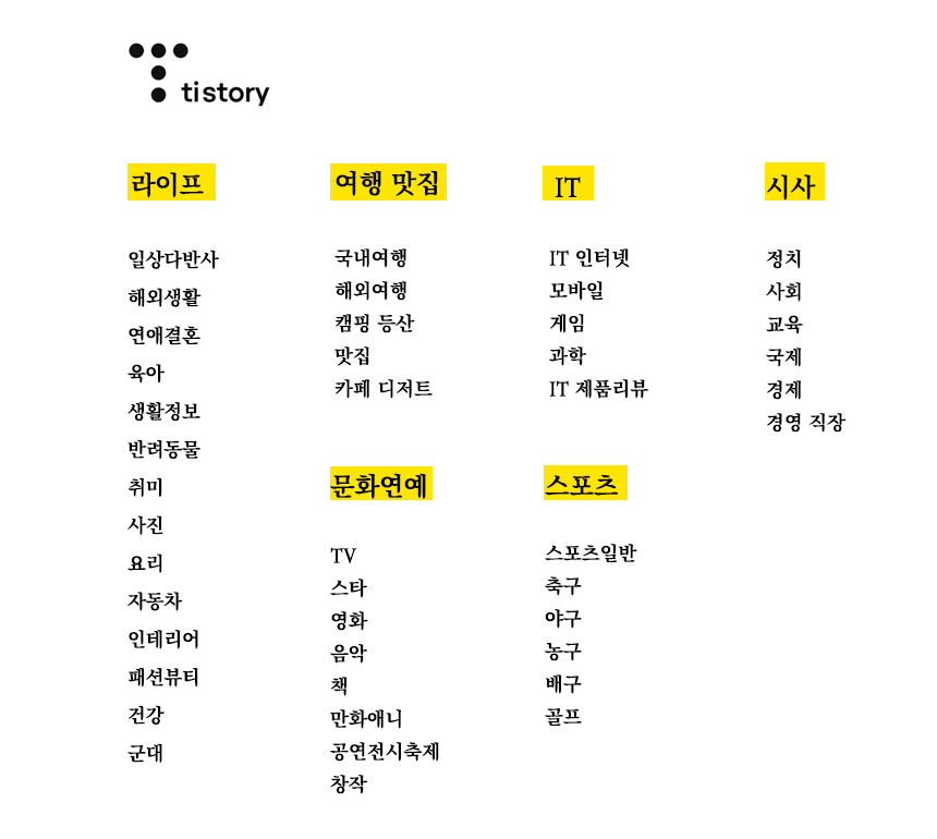 현재 구체적으로 티스토리와 네이버에서 분류해 둔 블로그 주제를 살펴보면 다음과 같다.