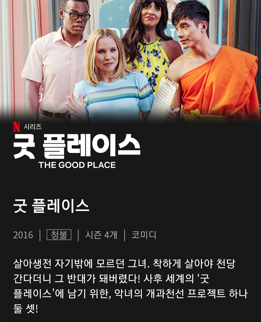 그러므로 천국과 지옥, 사후세계, 착한 사람, 나쁜 사람, 철학 등에 관심 있다면 넷플릭스에서 시즌 1이라도 한번 보기를 추천한다.