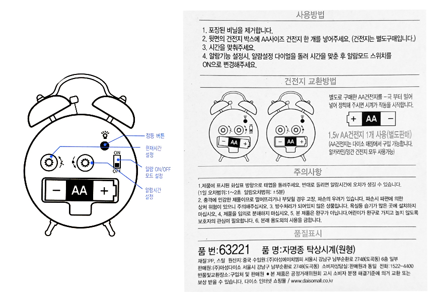 사용 방법은 건전지를 넣어준 다음 상자 케이스에 적힌 사용설명서대로 시계와 알람을 맞춰주면 된다.