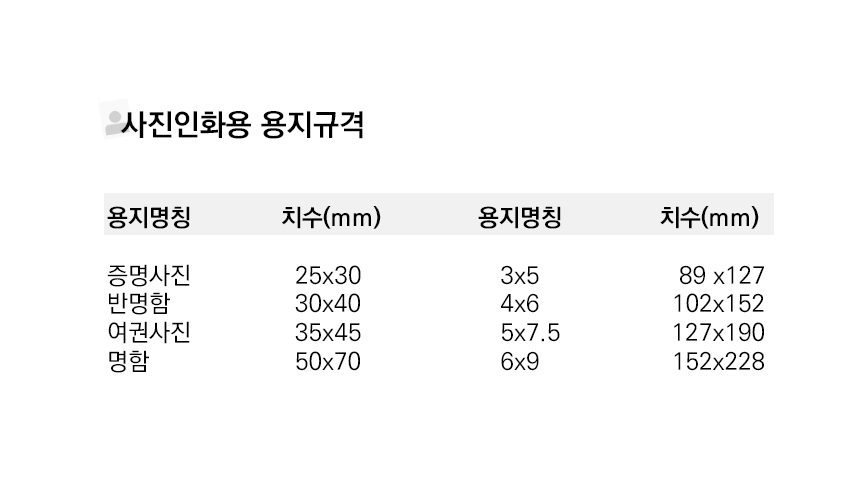| 증명사진 | 25x30 | 3x5 | 89x127 |