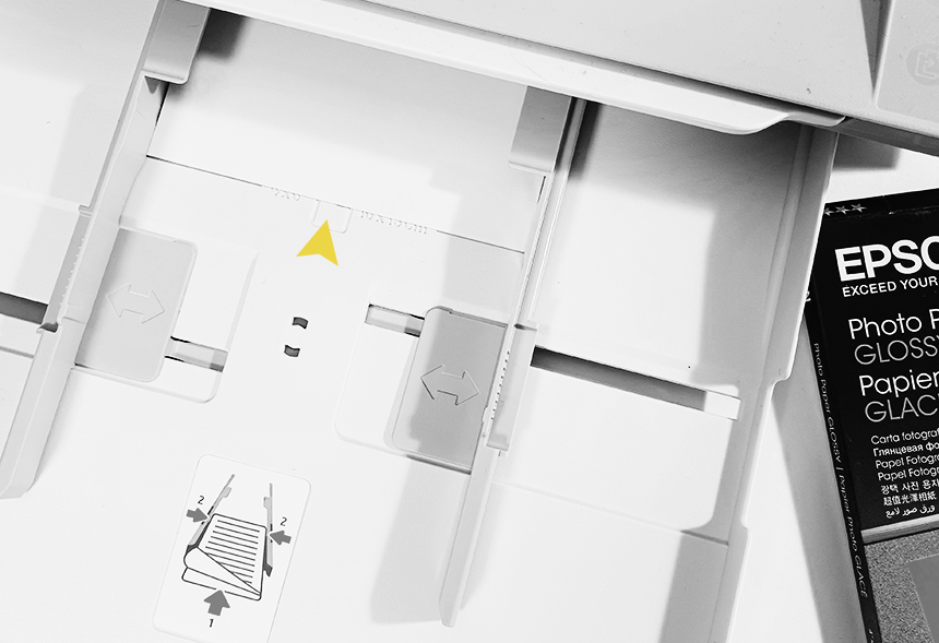 프린트기의 용지 보관함을 연 다음 구입한 사진 용지 크기에 맞게 용지 너비 조절 가이드를 조절해 용지를 넣어준다.