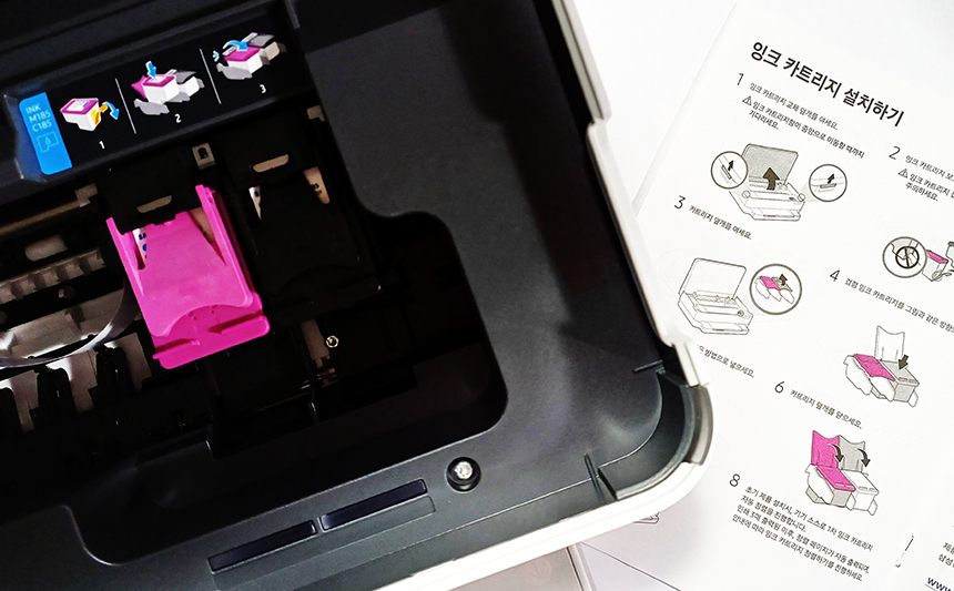 구입하면 전원 코드, USB 케이블, 설명서, 제품보증서와 함께 검정, 컬러 2개의 잉크 카트리지도 함께 동봉되어 있으므로 바로 출력해서 사용할 수 있다.