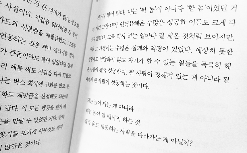 그리고 지금은 내가 느끼고 생각한 것들을 나누는 콘텐츠 크리에이터로 살아가고 있지만, 이 일 역시 평생 할 거라고는 생각하지 않는다. 나중에 나이가 들어 나를 설레게 하는 다른 일이 생기면 언제든지 일의 형태는 바뀔 수 있다고 생각한다.