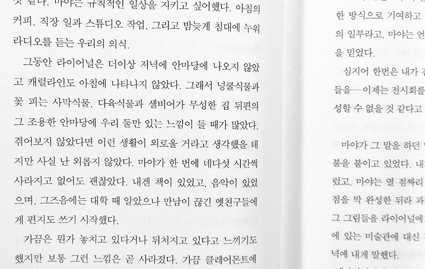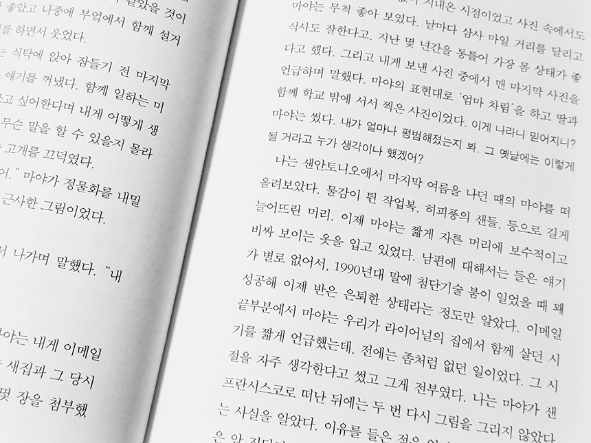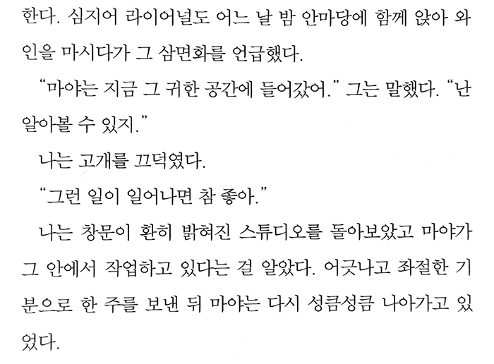 그리고 또한 어떤 의미에서는 "매일 밤 기온이 37도를 넘어가던 그 7월에, 어스름한 저녁 빛에 물든 라이어널의 스튜디오에서 그 그림들을 그리던 마야를 나는 기억한다" 처럼 아주 짧은 날에 일어났던 일이나 그 속에서 만난 사람도 먼 훗날에는 잊히지 않고 그런 기억한다 처럼 남았으면 좋겠다는 생각이 들었다.