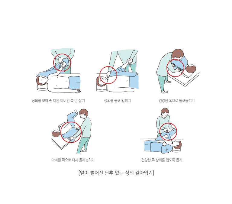 입힐 때 : 불편한(편마비) 쪽 먼저
