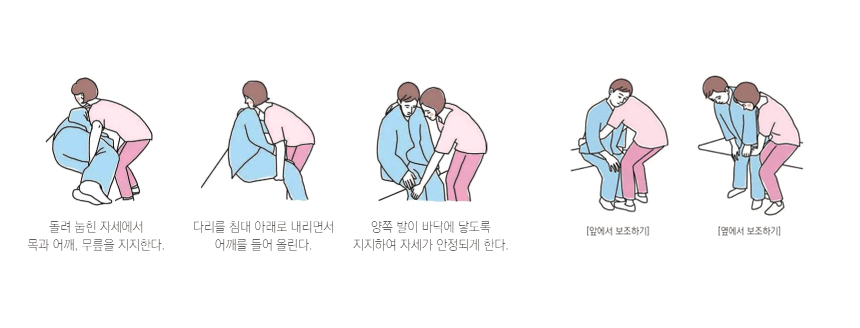 요양보호사는 무릎을 대상자의 다리 사이에 충분히 넣고 지지면을 확보한 후 양팔로 대상자의 겨드랑이 밑으로 등 뒤를 감싸 안아 반동을 이용하여 대상자를 세운다.